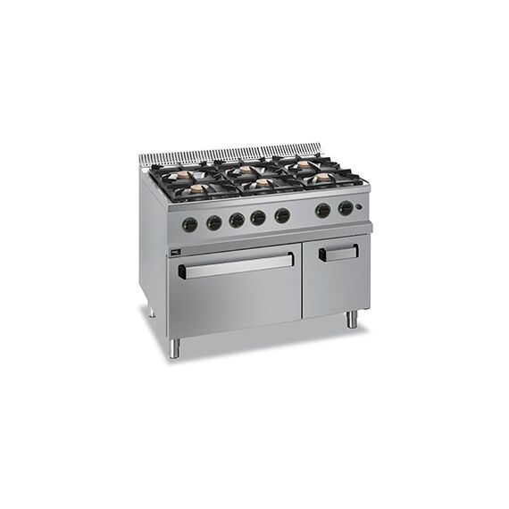 Газовая 6-конфорочная плита 700 серии APRG-117FG предназначена для приготовления различных блюд в наплитной посуде.Столешница, вентиляционная решетка и передняя панель плиты выполнены из нержавеющей стали AISI 304, боковые и задняя панели - из нержавеющей стали AISI 430. Толщина металла 1 мм.Плита оснащена 6 съемными конфорками из эмалированного чугуна с латунной крышкой со стабилизатором пламени и защищенной пилотной горелкой. Мощность каждой конфорки 7 кВт. Поджиг пилотной горелки производится вручную.Предусмотрена отдельная чугунная решетка для каждой конфорки, размером 335х300 мм.Данная модель оснащена статическим газовым жарочным шкафом, мощностью 6 кВт. Размер жарочного шкафа 560х630х300 мм. Модель настроена на подключение к магистральному газу. Форсунки для подключения к баллонному газу в комплекте.Плита оснащена регулируемыми ножками.Общая газовая мощность плиты 48 кВт. Габариты 1100х700х850 мм.