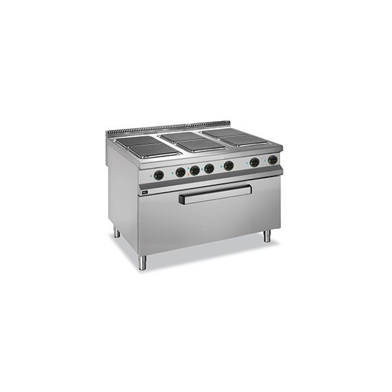Электрическая 6-конфорочная плита 900 серии APRE-129FEM предназначена для приготовления различных блюд в наплитной посуде. Столешница, вентиляционная решетка и передняя панель плиты выполнены из нержавеющей стали AISI 304, боковые и задняя панели - из нержавеющей стали AISI 430. Толщина металла 1 мм.Плита оснащена 6 чугунными конфорками с защитой от перегрева, размером 300х300 мм. Мощность конфорок: 4x3кВт+2x4 кВт.Каждая конфорка имеет 6 уровней мощности нагрева и снабжена световым индикатором работы нагревательного элемента.Данная модель оснащена статическим жарочным шкафом, мощностью 10 кВт. Размер жарочного шкафа 1000х695х290 мм. Модель укомплектована регулируемыми ножками.Данную модель можно использовать как самостоятельно, так и в составе технологической линии.Плита работает от сети с напряжением 380В, потребляемая мощность 30 кВт. Габариты 1200х900х850 мм.
