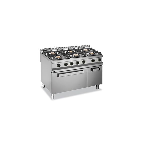 Газовая 6-конфорочная плита 900 серии APRG-129FE предназначена для приготовления различных блюд в наплитной посуде.Столешница, вентиляционная решетка и передняя панель плиты выполнены из нержавеющей стали AISI 304, боковые и задняя панели - из нержавеющей стали AISI 430. Толщина металла 1 мм.Плита оснащена 6 съемными конфорками из эмалированного чугуна с латунной крышкой со стабилизатором пламени и защищенной пилотной горелкой. Мощность конфорок: 3x7 кВт+3x11 кВт. Поджиг пилотной горелки производится вручную.Данная модель оснащена статическим электрическим жарочным шкафом, мощностью 6 кВт. Размер жарочного шкафа 560х700х300 мм. Жарочный шкаф работает от сети с напряжением 380В.Модель настроена на подключение к магистральному газу. Форсунки для подключения к баллонному газу в комплекте.Плита оснащена регулируемыми ножками.Данную модель можно использовать как самостоятельно, так и в составе технологической линии.Общая газовая мощность плиты 54 кВт. Габариты 1200х900х850 мм.