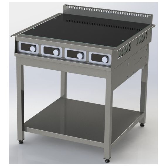 ЧЕЛЯБТОРГТЕХНИКА Плита электрическая индукционная ИПЭ-4 К 3х3,5/1х5, 4 конфорки: 3 конф. по 3,5 кВт; 1 конф. - 5,0 кВт; общая потребляемая мощность- 15,5 кВт. Напряжение 220/380, В. Время закипания 1л воды примерно 3,5 минуты. Корпус плиты электрической индукционной выполнен полностью из нерж. cтали марки AISI 430 толщиной 1,2мм. Каркас разборный выполнен из профильных элементов нерж. стали марки AISI 430 толщиной 1,2 мм. , ножки из нерж. трубы 40х40 марки AISI 430. Каждая плита имеет боковые планки и задний спойлер для обеспечения вентиляции. Плиты оснащены регулируемыми по высоте опорами. Масса плиты 50кг. Габаритные размеры: 805(725)х900х860,мм.