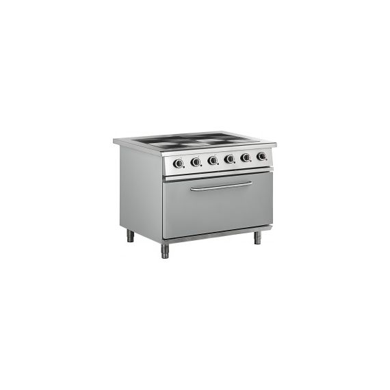 1050х850х860мм, 400В,4 конф, 15 кВт, духовой шкаф - 4 кВт. 4 чугунные разборные конфорки 285*415 мм. образуют ровную поверхность (2 конф. х 3 кВт + 2 конф. х 2.5 кВт) Облиц.- нерж. сталь . Дверь духовки, задняя, боковые стенки - оцинкованная сталь, покрытая порошковой краской, ножки нерж. сталь . Станд. комп.: противень из углеродистой стали (525*480*30мм, ) - 3шт.