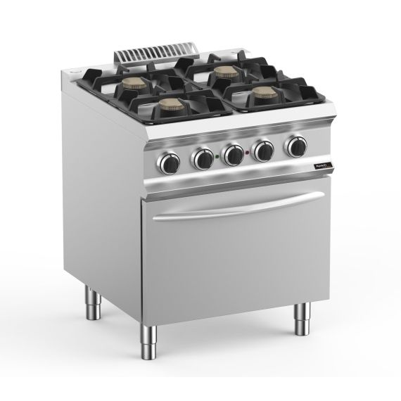 700х730х850 мм, 95 кг, газ 28 кВт, 380 В, 4 конфорки, на электрическом духовом шкафу на 5,3 кВт