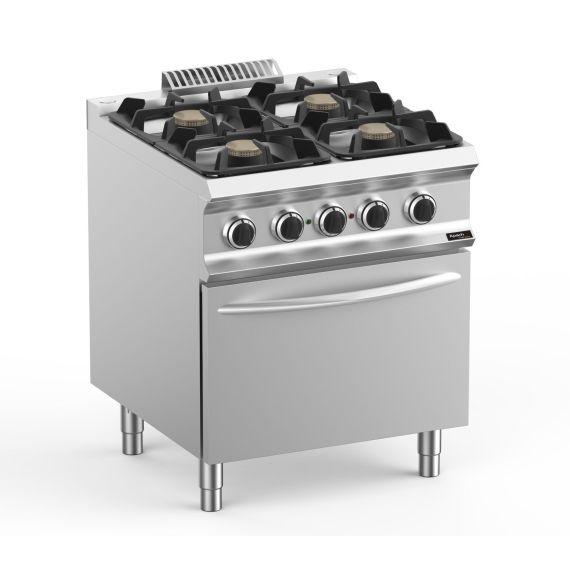 700х730х850 мм, 95 кг, газ 22 кВт, 230 В, 4 конфорки, на электрическом вентилируемом духовом шкафу на 2,6 кВт