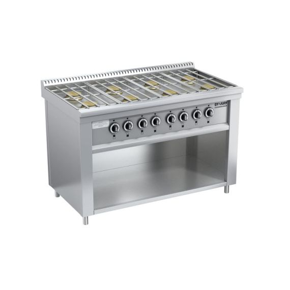 Напольная газовая плита с 8-ю мощными горелками по 6 кВт и съёмной решеткой из нержавеющей стали, позволяющей свободно перемещать посуду по всей ее поверхности. На решетке одновременно размещаются 8 кастрюль объёмом 30 л. В нижней части плиты имеется ниша для хранения кухонного инвентаря. Плита оснащена системой газконтроля и может работать как на природном, так и на сжиженном газе. Корпус изготовлен из высококачественной нержавеющей стали, что значительно облегчает уход за плитой. Герметичная столешница дает возможность производить влажную уборку, исключая попадание жидкости во внутренние полости плиты. Ножки плиты регулируются по высоте, компенсируя неровности пола. С выкрученными ножками высота плиты составляет 760 мм, что существенно облегчает ее транспортировку, позволяя занести в стандартный дверной проем. Плита идеально подходит для предприятий общественного питания с высокой проходимостью. Главными ее достоинствами являются простота эксплуатации и большая производительность. Технические характеристи