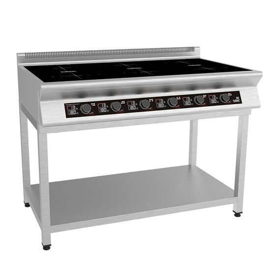 1100х700х870 Плита индукционная на открытой подставке, 6 конфорок мощностью 6х3,5кВт, электронная панель управления с цифровой индикацией, 13 уровней нагрева, таймер до 180мин., съемный жировой фильтр, корпус из н.с. AISI 304, регулируемые по высоте ножки, рабочая поверхность - стеклокерамика 6мм, 21 кВт, 380В.