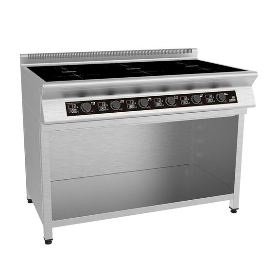 1100х700х870 Плита индукционная на полузакрытой подставке, 6 конфорок мощностью 6х3,5кВт, электронная панель управления с цифровой индикацией, 13 уровней нагрева, таймер до 180мин., съемный жировой фильтр, корпус из н.с. AISI 304, регулируемые по высоте ножки, рабочая поверхность - стеклокерамика 6мм, 21 кВт, 380В.