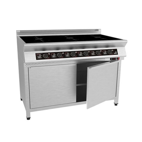 1100х700х870мм, Плита индукционная на тепловой подставке, 6 конфорок мощностью 6х3,5кВт, электронная панель управления с цифровой индикацией, 13 уровней нагрева, таймер до 180мин., корпус плиты из н.с. AISI 304, рабочая поверхность - стеклокерамика 6мм, мощнось подставки 2кВт, перф. полка регулируемая по высоте, электронная реулировка температуры до 60С, регулируемые по высоте ножки, 23кВт, 380В.
