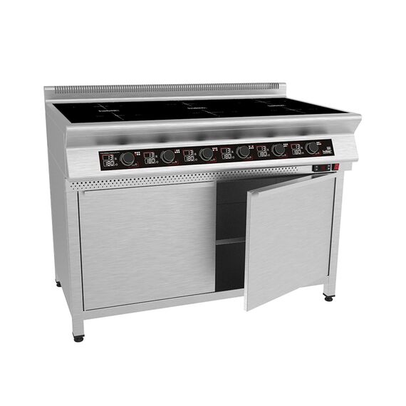 1175х900х870мм, Плита индукционная на тепловой подставке, 6 конфорок мощностью 6х3,5кВт, электронная панель управления с цифровой индикацией, 13 уровней нагрева, таймер до 180мин., корпус плиты из н.с. AISI 304, рабочая поверхность - стеклокерамика 6мм, мощнось подставки 2кВт, перф. полка регулируемая по высоте, электронная реулировка температуры до 60С, регулируемые по высоте ножки, 23кВт, 380В.