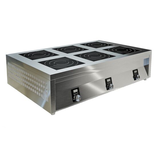 1200х900х300мм, Плита 6конфорочная плоская островная, столешница из нержавеющей стали марки AISI 304 толщиной 1,2 мм, корпус из нержавеющей стали марки AISI 430 толщиной 0,8мм. Мощность 6х5 кВт, без борта, питание 380В. Толщина стеклокерамики 6мм. 9 уровней мощности. Поставляется в собранном виде., для ИПП-640147 подходят подставки СПИ-033/1219, СПИ-837/1219, СПИ-834/1219, -, -