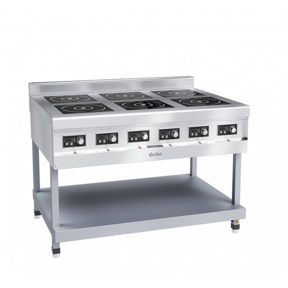 1220х900х940(960)мм, Плита индукционная 6-ти конфорочная КИП-69П-3,5, краш. подставка, 1220х900х940 мм, 9 ур. мощности, +60…+240 С, 21 кВт, 400 В, 6 независимых индукторов, стеклокерамика 6 мм, 2 жироулавливающих фильтра, защита от перегрева