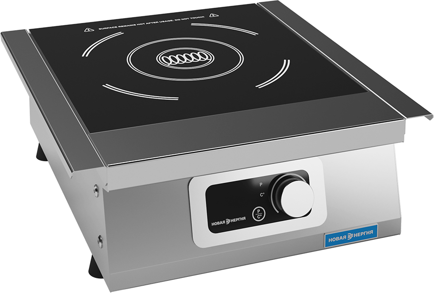 Плита индукционная электрическая относится к торговой марке «Новая энергия» предназначена для тепловой обработки полуфабрикатов в специально разработанных для индукционных плит функциональных емкостях (варки, жарки, тушения и пассировки) на предприятиях общественного питания. Исполнение – настольное. Имеет 1 конфорку, с потребляемой мощностью – 2,5кВт. Допустимая максимальная распределённая нагрузка на конфорку 50кг. Полезный диаметр посуды не менее 12см. Время закипания 1л воды примерно 3 минуты.