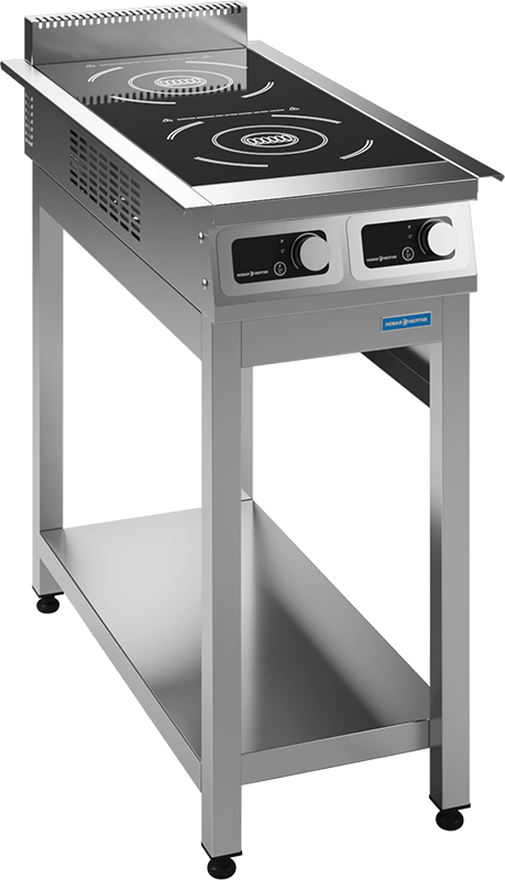 Плита индукционная электрическая относится к торговой марке «Новая энергия» предназначена для тепловой обработки полуфабрикатов в специально разработанных для индукционных плит функциональных емкостях (варки, жарки, тушения и пассировки) на предприятиях общественного питания. Имеет 2 конфорки, с потребляемой мощностью – 6кВт (конфорки 2,5 кВт и 3,5 кВт). Допустимая максимальная распределённая нагрузка на конфорку 50кг. Полезный диаметр посуды не менее 12 см. Время закипания 1л воды на конфорке 3,5 кВт примерно 2 минуты. Время закипания 1л воды на конфорке 2,5 кВт примерно 3 минуты. Плита оснащена регулируемыми по высоте опорами. Габаритные размеры: 445х900х860.
