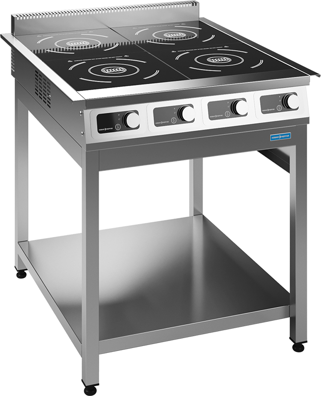 Плита индукционная электрическая относится к торговой марке «Новая энергия» предназначена для тепловой обработки полуфабрикатов в специально разработанных для индукционных плит функциональных емкостях (варки, жарки, тушения и пассировки) на предприятиях общественного питания. Имеет 4 конфорки, с общей потребляемой мощностью – 13кВт (1 конфорка 2,5 кВт, 3 конфорки – 3,5 кВт). Допустимая максимальная распределённая нагрузка на конфорку 50кг. Полезный диаметр посуды не менее 12 см. Время закипания 1л воды на конфорке 3,5 кВт примерно 2 минуты. Время закипания 1л воды на конфорке 2,5 кВт примерно 3 минуты. Плита оснащена регулируемыми по высоте опорами. Габаритные размеры: 805х900х860.