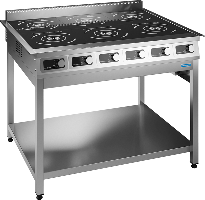 Плита индукционная электрическая относится к торговой марке «Новая энергия» предназначена для тепловой обработки полуфабрикатов в специально разработанных для индукционных плит функциональных емкостях (варки, жарки, тушения и пассировки) на предприятиях общественного питания. Имеет 6 конфорок, с общей потребляемой мощностью – 19кВт (4 конфорки по 3,5 кВт, 2 конфорки – 2,5 кВт). Допустимая максимальная распределённая нагрузка на конфорку 50кг. Полезный диаметр посуды не менее 12 см. Время закипания 1л воды на конфорке 2,5 кВт примерно 3 минуты, на конфорке 3,5 кВт – 2 минуты. Плита оснащена регулируемыми по высоте опорами.