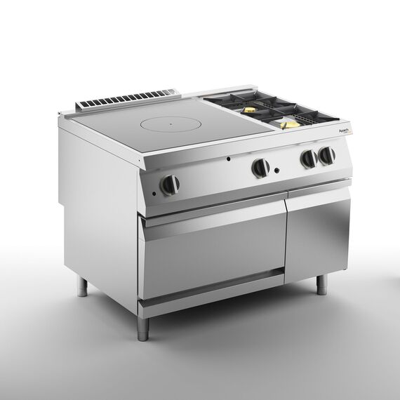 1200х900х900 мм, 205 кг, газ 37 кВт, 1 зона концентрического нагрева + 2 горелки справа, на газовом духовом шкафу на 9 кВт