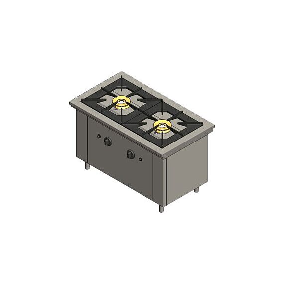 955х555х600мм, 2х8кВт, Плита-табурет из нержавеющей стали с 2-мя мощными латунными двухрядными горелками. Каждая горелка имеет чугунную решетку размером 430х430мм, что позволяет размещать на ней гастроемкости объёмом до 50 л. Газконтроль, запальная горелка, пьезоподжиг каждой горелки, работа на природном или сжиженном газе.