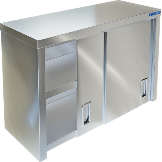 900х350х600мм, Полка-шкаф настенная сварная из нержавеющей стали марки AISI 304 толщиной 0,8мм, две двери-купе, внутри полка, задняя стенка оцинкованная сталь толщиной 0,55мм. Имеет накладки с вырезом замочная скважина для крепления к стене. Полка поставляется в собранном виде.