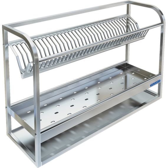 950х300х600мм, Полка настенная для сушки посуды разборная из нержавеющей стали марки AISI 304 толщиной 0,8мм, 2 ур - кассета из нержавеющей стали марки AISI 304 толщиной 0,8мм на 35 тарелок, полка перфориванная на 50 стаканов, поддон из нержавеющей стали марки AISI 304 толщиной 0,8мм, боковина из листа толщиной 1,5мм. Полка поставляется в собранном виде.