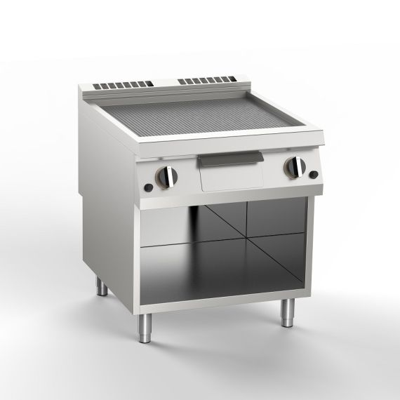 Газовая жарочная поверхность серии 900 SLFTG89LRCS предназначена для обжарки мяса, рыбы, котлет и овощей.Конструкция жарочной поверхности выполнена из нержавеющей стали AISI 304. Толщина металла 2 мм.Модель оснащена рифленой жарочной поверхностью из конструкц. стали, толщиной 15 мм, с одной зоной нагрева размером 745x700 мм. Нагрев производится армированными нагревательными элементами из нержавеющей стали. Стабильность температуры и точный термостатический контроль в диапазоне от 110 до 180 °C позволяют готовить деликатные блюда. Для защиты от брызг присутствует борт из нержавеющей стали, толщиной 3 мм.У жарочной поверхности предусмотрен небольшой уклон для облегчения очистки и слива излишков жира в съемный жиросборник из нержавеющей стали, объемом 2,5 литра. Данная модель укомплектована закрытой подставкой с регулируемыми ножками.Данную модель можно использовать как самостоятельно, так и в составе технологической линии.Газовая мощность жарочной поверхности 14 кВт. Габариты 800х900х900 мм.
