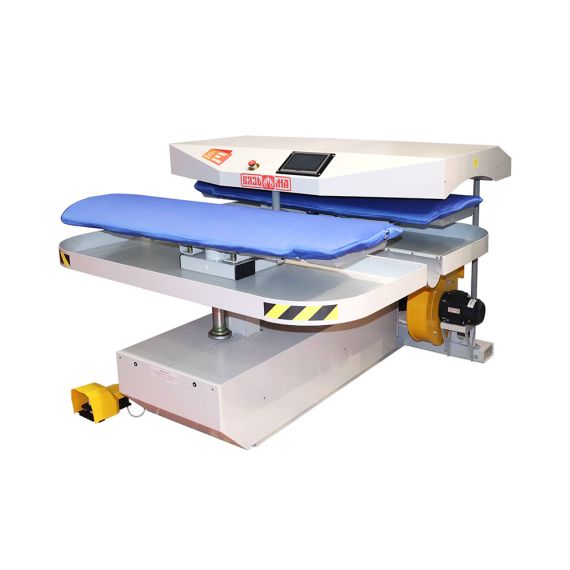 Промышленные гладильные прессы карусельного типа ВР предназначены для глажения прямого и фасонного белья. Принцип глажения состоит в поочередном прижиме гладильных столов с уложенным на них бельем к нагретой верхней гладильной плите, пока один стол прижат - происходит процесс глажения, в это время на втором столе, оператор раскладывает другое белье. По окончании глажения первый стол опускается, как только оператор нажимает педаль - столы меняются местами. Процесс глажения повторяется для второго стола. Выглаженное белье заменяется новым и цикл повторяется.