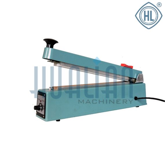 Импульсный настольный ручной запайщик с центральным ножом. Запайщик имеет запаечную планку в 300мм и ширину шва 2.5-3мм. Так же он оснащен центральным ножом, который встроен в корпус, что позволяет практически под шов удалять излишки пакета оставляя незначительный «хвост». Запайщик сделан из металла. Достаточно часто используется на мелких пищевых и не пищевых производствах.