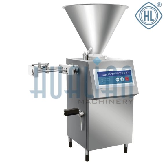 Процесс формования - важный технологический этап в производстве колбасных изделий. Качественно справится с этим процессом помогут пневматические шприцы серии DG-Q02. Высокая производительность при наполнении колбасной оболочки в таких шприцах достигается за счет использования пневматики, при этом значительно снижаются затраты на электроэнергию. Специальное устройство позволяет осуществлять быструю замену цевок, что повышает эффективность пневматического шприца вдвое. В то время как одна цевка задействована в производстве, на другую в это время можно надевать новую оболочку. В комплекте с аппаратом поставляется два вида цевок, с диаметром на выбор заказчика. В зависимости от производимой продукции, пневматические поршневые шприцы могут оборудоваться автоматическим устройством перекрутки оболочки или соединяться с клисатором.