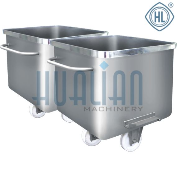 Тележка-чан для фарша объёмом на 200 литров предназначена для транспортировки мясного сырья, фарша, ингредиентов и готовой продукции в цехах пищевых производств. Конструкция предполагает использование со всеми типами загрузчиков-опрокидывателей. Используемые материалы позволяют эксплуатировать такие тележки в низкотемпературных холодильных камерах и камерах дозревания. Представляет собой ёмкость из нержавеющей стали специальной конструкции, предотвращающей скопление продукта и позволяющей при механическом опрокидовании производить полную выгрузку, без остатков. Также конструкция облегчает легкую санитарную обработку. Верхние края ёмкости имеют ребро жесткости.