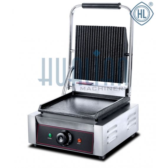 Особенностью данной модели является то, что рифленой является только верхняя рабочая поверхность, а нижняя – плоская. Поэтому аппарат отлично приспособлен для таких форматов торговли как fast-food и street-food. С его помощью можно приготовить такие популярные блюда уличной торговли как блинчики (панини), хот-доги, шаурма, гамбургеры и пр. Благодаря гладкой нижней поверхности гриль подходит для приготовления яичницы и тостов. Жарочные поверхности выполнены из высококачественного чугуна с антипригарным покрытием. Компактный металлический корпус запатентованной формы обладает прекрасной эргономикой и функциональностью. Для прижимания верхнего блока предусмотрена удобная ручка из термостойкого материала.