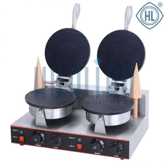 Модель оснащена двумя рабочими секциями с независимым управлением – у каждой секции имеется свой таймер, регулятор температуры и кнопка выключателя. Температура регулируется плавно. В комплект поставки входят 2 деревянных конуса для сворачивания вафли в рожок.
