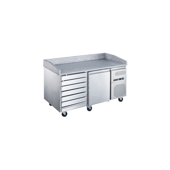 1515x800x1000 мм, 230В, 0,215 кВт, 390 л, -2…+8 C, каменная столешница с 3 бортами, 1 дверь + 7 ящиков, ящики без охлаждения, полка 600х400, одна полка в комплекте, боковое расположение холодильного агрегата, динамическое охлаждение, на колесах