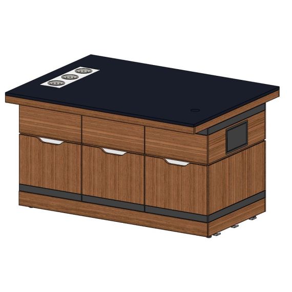 Нестандарт: встроенные стаканы для приборов Прилавок-кофестанция относится к Шведским столам Filin торговой марки Refettorio. Прилавок используется для размещения кофемашины. Исполнение - островное. Столешница из искусственного камня. В столешнице имеется отверстие для подключения вспомогательного оборудования. Максимальная распределенная нагрузка на столешницу прилавка – 100 кг. Имеет светодиодную подсветку фасадной части. Прилавок оснащен тремя ящиками. В стандартный комплект поставки боковые фасады не входят (доп. опция).