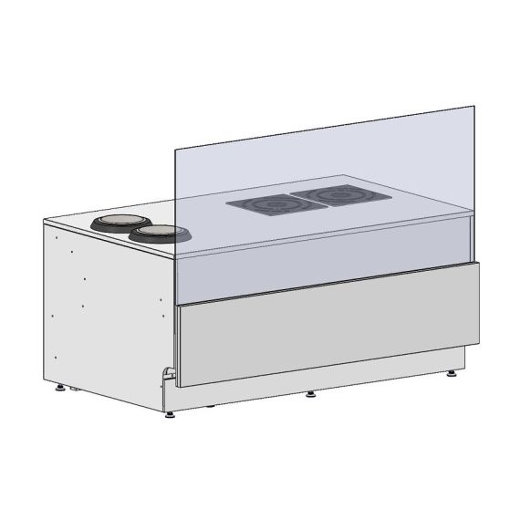 Прилавок тепловой серии VISTA торговой марки Refettorio. В состав прилавка входят две электросупницы объёмом по 10л и две индукционные конфорки мощностью – 3,5кВт. Встроенные электросупницы предназначены для поддержания в горячем состоянии первых блюд и раздачи их потребителю, диапазон регулировки температуры продукта от 0 до 95С°. Встроенные индукционные конфорки предназначены для длительного поддержания в горячем состоянии пищи и тепловой обработки пищевых полуфабрикатов в специально разработанных для индукционных плит функциональных емкостях. Фронтальные и боковые панели не входят в стандартную комплектацию.