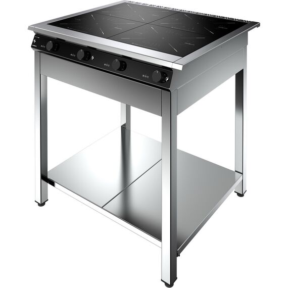 Плита электрическая индукционная модернизированная ICG9 - 4 PRO предназначена для тепловой обработки полуфабрикатов в специально разработанных для индукционных плит функциональных емкостях (варки, жарки, тушения и пассировки) на предприятиях общественного питания. Индукционная плита имеет систему управления, вынесенную на лицевую панель плиты. Имеет 4 конфорки, с потребляемой мощностью – 3,5кВт. Размер рабочей поверхности (стеклокерамика) 380х380мм. Толщина рабочей поверхности 6 мм. Уровни ручного регулирования мощности от 1 до 9. Допустимая максимальная распределённая нагрузка на конфорку 50кг. Количество жироулавливающих фильтров - 4шт. Имеет функцию проверки пригодности используемой посуды. Использовать специально предназначенную для индукционных плит посуду, которая имеет основание днища диаметром не менее 12см. Время закипания 1л воды примерно 2 минуты. Модуль плиты устанавливается на подставку.