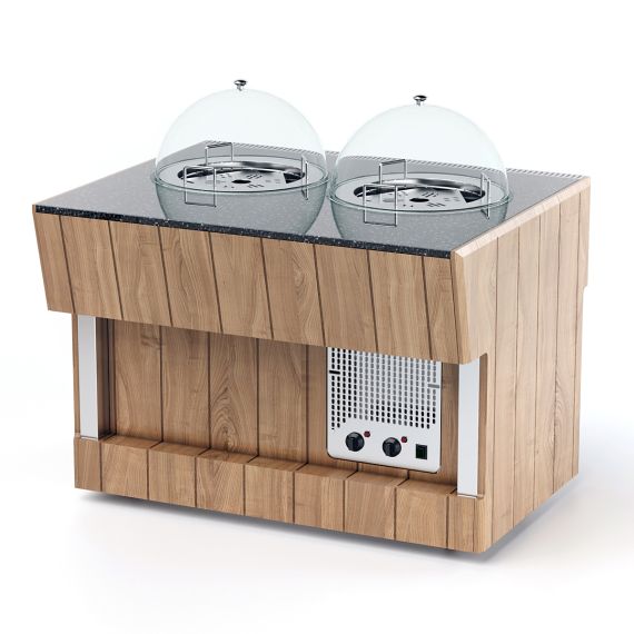 Прилавок диспенсер для тарелок тепловой относится к Шведским столам «Kids» торговой марки «Refettorio». Диспенсер предназначен для обеспечения клиентов тарелками. Исполнение - пристенное. Столешница из искусственного камня. Диспенсер снабжен выталкивающим устройством - лифт. Шахта лифта оснащена подогревом. Тип электронагревательного устройства – трубчатый электронагреватель (ТЭН). Режим терморегулирования от 30 до 90С°. В комплект входит крышка-купол из оргстекла. Имеет светодиодную подсветку фасадной части. Может комплектоваться столешницами-вставками (доп. опция). В стандартный комплект поставки фасады не входят (доп. опция).