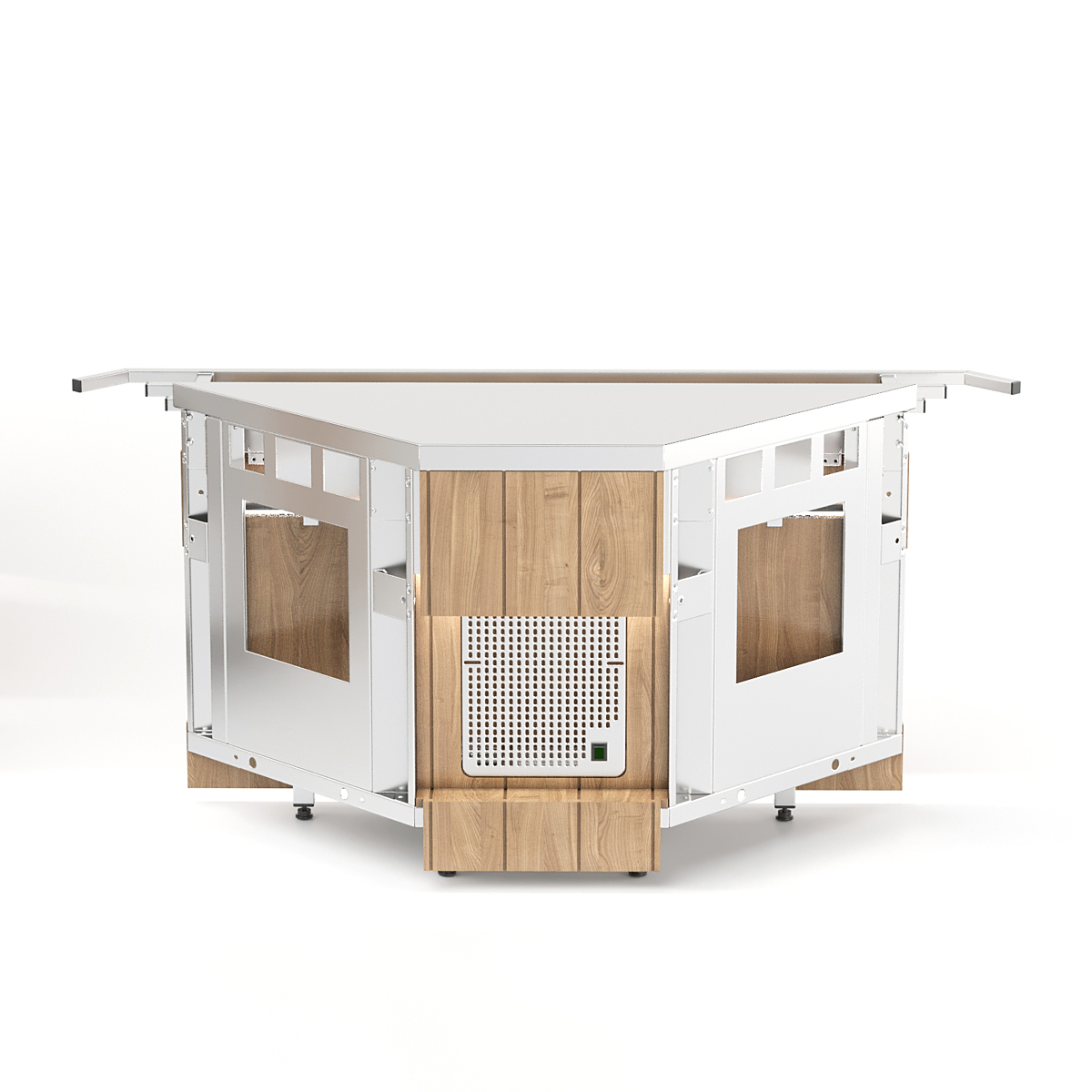 Прилавок нейтральный угловой внутренний относится к Шведским столам «Kids» торговой марки «Refettorio». Используется для удобства комплектации модулей под углом 90 градусов в линию прилавков, является промежуточным вспомогательным элементом. Исполнение - островное. Столешница из нержавеющей стали. Имеет светодиодную подсветку в нише фасадной части.