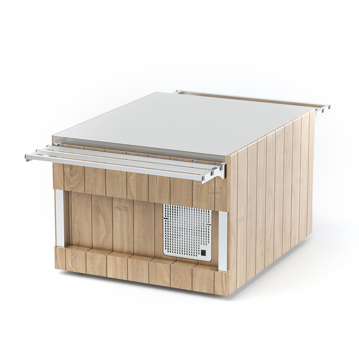 Прилавок нейтральный относится к относится к Шведским столам «Kids» торговой марки «Refettorio». Прилавок используется в качестве вспомогательного элемента. Исполнение – сдвоенное. Столешница из нержавеющей стали. Прилавок оснащён стеклянными полками. Максимальная распределенная нагрузка на полку 15кг. Имеет светодиодную подсветку в нише фасадной части и подсветку рабочей зоны. В стандартный комплект поставки направляющая и фасады не входят (доп. опция).