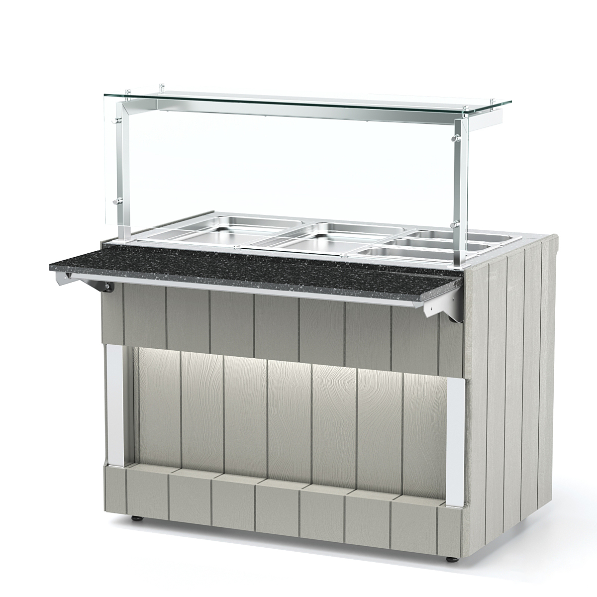 Мармит для вторых блюд относится к линии раздачи «Kids» торговой марки «Refettorio». Мармит предназначен для кратковременного хранения в горячем состоянии вторых блюд в функциональных емкостях и раздачи их потребителю. Столешница из искусственного камня. Теплоноситель паровой. Тип электронагревательного устройства -пластинчатый электронагреватель (ПЭН). Мармит оснащен полкой и защитным стеклом. Максимальная распределенная нагрузка на стеклянную полку 10кг. Имеет светодиодную подсветку в нише фасадной части и подсветку рабочей зоны. Со стороны персонала в мармите есть ниша для инвентаря и розетка с защитной крышкой - 1шт. Как дополнительная опция ниша может быть снабжена створчатой дверкой. В стандартный комплект поставки направляющая, фасады и гастроёмкости не входят (доп. опция). Ширина прилавка, указанная в ее наименовании, не учитывает ширину фасадов. Полный габаритный размер по ширине указан в чертеже общего вида прилавка.