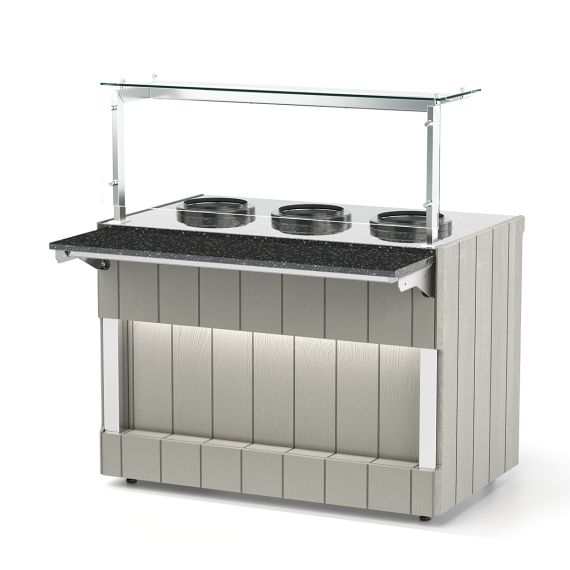 Мармит для первых блюд с электросупницами относится к линии раздачи «Kids» торговой марки «Refettorio». Мармит предназначен для поддержания в горячем состоянии емкостей с первыми блюдами и раздачи их потребителю. Столешница из искусственного камня. Вместимость супницы - 10 литров. Электросупницы - 4 шт. Терморегулятор от 0 до 95С°. Мармит оснащен полкой и защитными стеклами. Максимальная распределенная нагрузка на стеклянную полку 15кг. Имеет светодиодную подсветку в нише фасадной части и подсветку рабочей зоны. Со стороны персонала в мармите есть ниша для инвентаря и розетки с защитной крышкой. Как дополнительная опция ниша может быть снабжена створчатой дверкой. В стандартный комплект поставки направляющая и фасады не входят (доп. опция).