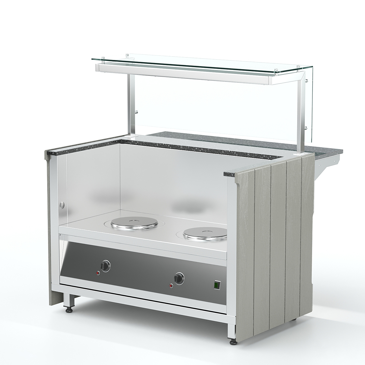 Мармит для первых блюд относится к линии раздачи «Kids» торговой марки «Refettorio». Мармит предназначен для кратковременного хранения в горячем состоянии емкостей с первыми блюдами и раздачи их потребителю. Столешница из искусственного камня. Тип электронагревательного устройства -трубчатый электронагреватель (ТЭН), материал конфорки - чугун. Мармит оснащен полкой и защитными стеклами. Максимальная распределенная нагрузка на стеклянную полку 15кг. Имеет светодиодную подсветку в нише фасадной части и подсветку рабочей зоны. В стандартный комплект поставки направляющая и фасады не входят (доп. опция).