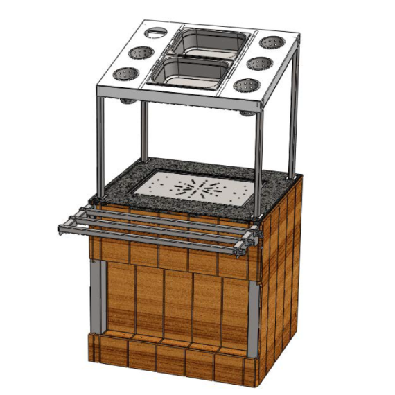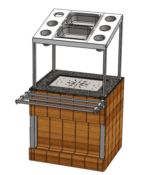 Диспенсер для подносов и столовых приборов относится к линии раздачи «Kids» торговой марки «Refettorio». Столешница из искусственного камня. Оснащен функциональными емкостями (стаканы+GN). Вместимость: стаканы 6 шт, 2 гастроемкости GN 1/2 Н65. Имеет светодиодную подсветку фасадной части. Со стороны персонала в диспенсере есть ниша для инвентаря. Как дополнительная опция ниша может быть снабжена створчатой дверкой. В стандартный комплект поставки направляющая и фасады не входят (доп. опция).