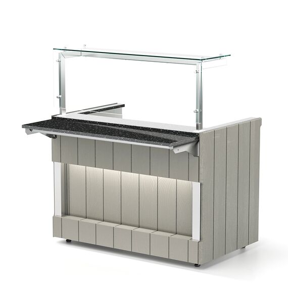 Прилавок нейтральный П-образный относится к линии раздачи «Kids» торговой марки «Refettorio». Столешница выполнена с вырезом и имеет П-образную форму. Столешница из искусственного камня. Для удобства подключения электроприборов на панели прилавка вмонтированы две розетки с защитными крышками. Прилавок оснащен полкой и защитным стеклом. Максимальная распределенная нагрузка на стеклянную полку 15кг. Имеет светодиодную подсветку в нише фасадной части и подсветку рабочей зоны. В стандартный комплект поставки направляющая и фасады не входят (доп. опция).