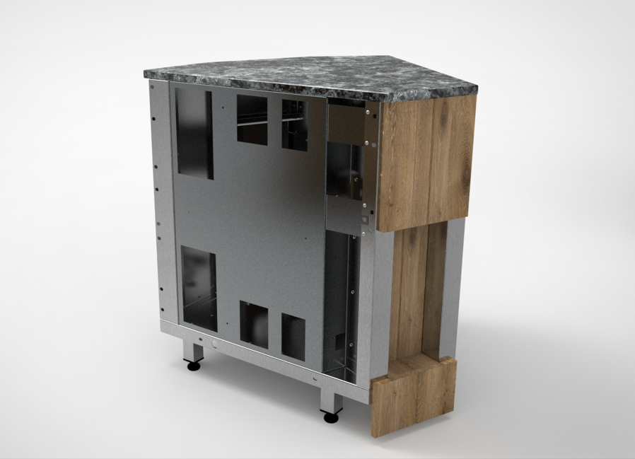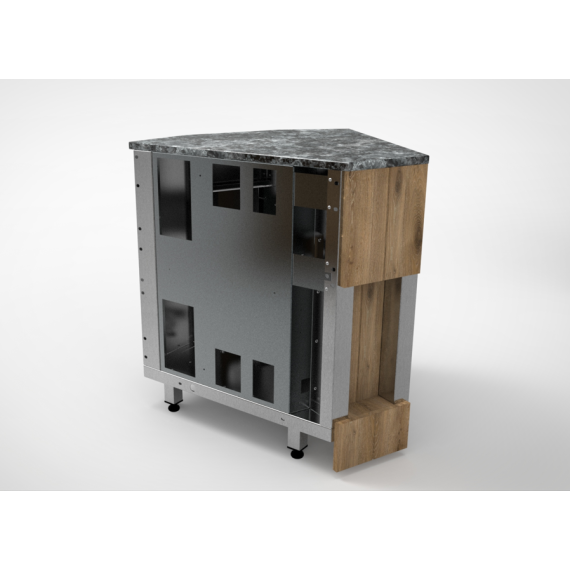 Прилавок нейтральный угловой внутренний относится к линии раздачи «Kids» торговой марки «Refettorio». Используется для удобства комплектации модулей под углом 45 градусов в линию прилавков, является промежуточным вспомогательным элементом. Столешница из искусственного камня. Имеет светодиодную подсветку в нише фасадной части. Со стороны персонала имеются розетки с защитной крышкой. В стандартный комплект поставки фасады не входят (доп. опция).