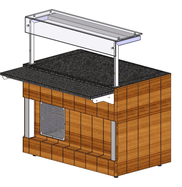 Прилавок с охлаждаемой поверхностью относится к линии раздачи «Kids» торговой марки «Refettorio». Предназначен для кратковременного хранения пищевых продуктов, демонстрации и раздачи холодных закусок, третьих блюд и охлажденных напитков потребителю. Столешница из искусственного камня. Класс прилавка высокотемпературный (от 1° до 10). Холодообеспечение встроенное. Тип оттаивания: естественный. Оснащен полкой и защитным стеклом. Максимальная распределенная нагрузка на стеклянную полку 15кг. Имеет светодиодную подсветку в нише фасадной части и подсветку рабочей зоны. Со стороны персонала в прилавке есть ниша для инвентаря и розетки с защитной крышкой. Как дополнительная опция ниша может быть снабжена створчатой дверкой. В стандартный комплект поставки направляющая и фасады не входят (доп. опция).