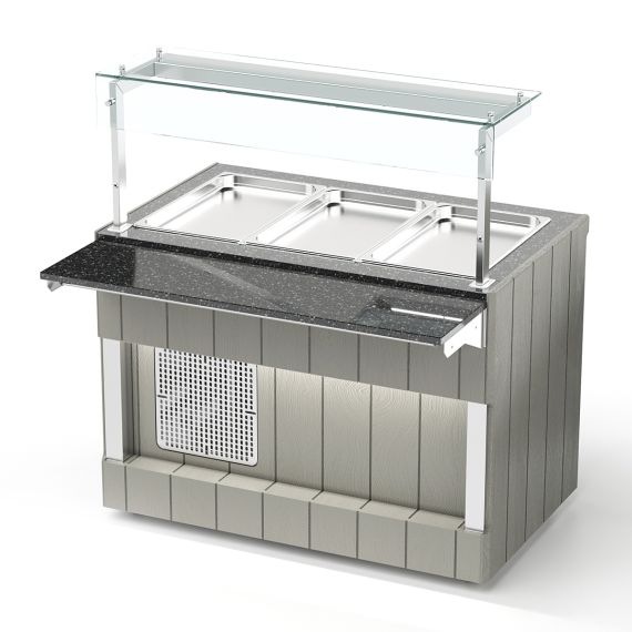 Прилавок холодильный относится к линии раздачи «Kids» торговой марки «Refettorio». Предназначен для кратковременного хранения пищевых продуктов, демонстрации и раздачи холодных закусок и третьих блюд. Столешница с углублением в 100 мм для установки функциональных емкостей. Столешница из искусственного камня. Класс прилавка высокотемпературный (от 1° до 10). Холодообеспечение встроенное. Тип оттаивания: естественный. Оснащен полкой и защитным стеклом. Максимальная распределенная нагрузка на стеклянную полку 15кг. Имеет светодиодную подсветку в нише фасадной части и подсветку рабочей зоны. Со стороны персонала в прилавке имеется розетка с защитной крышкой. В стандартный комплект поставки направляющая и фасады не входят (доп. опция).