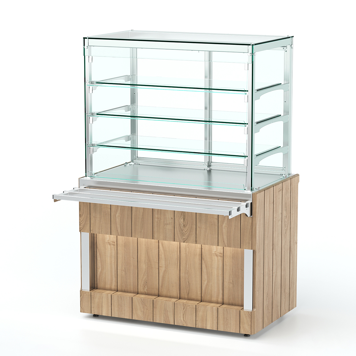 Витрина нейтральная относится к линии раздачи «Kids» торговой марки «Refettorio». Размещение пищевых продуктов полочное четырёхярусное, включая дно полезного объёма. Столешница из нержавеющей стали. Доступ к продуктам со стороны рабочего персонала осуществляется с помощью раздвижных створок витрины, со стороны потребителя доступ через откидные крышки. Максимальная распределенная нагрузка на стеклянную полку 15кг. Со стороны персонала в витрине есть ниша для инвентаря и розетка с защитной крышкой - 1шт. Как дополнительная опция ниша может быть снабжена створчатой дверкой. Витрина имеет светодиодную подсветку в нише фасадной части и подсветку витрины. В стандартный комплект поставки направляющая и фасады не входят (доп. опция).