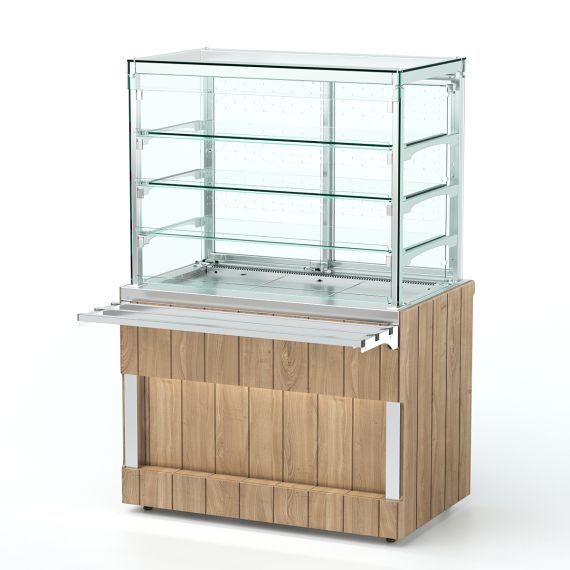 Витрина тепловая относится к линии раздачи «Kids» торговой марки «Refettorio». Витрина с внутренним тепловым объемом, предназначена для эффектной демонстрации и временного хранения готовых горячих блюд и выпечки. Рабочая температура витрины от 30° до 60°. В корпусе прилавка установлен ТЭН (трубчатый электронагреватель). Размещение пищевых продуктов полочное четырёхъярусное, включая дно полезного объёма. Доступ к продуктам со стороны рабочего персонала осуществляется с помощью раздвижных створок витрины, со стороны потребителя доступ через откидные крышки. Максимальная распределенная нагрузка на стеклянную полку 10кг. Имеет светодиодную подсветку ниши фасадной части и подсветку витрины. Имеется розетка с защитной крышкой - 1шт. Как дополнительная опция ниша прилавка может быть снабжена створчатой дверкой. В стандартный комплект поставки направляющая и фасады не входят (доп. опция).
