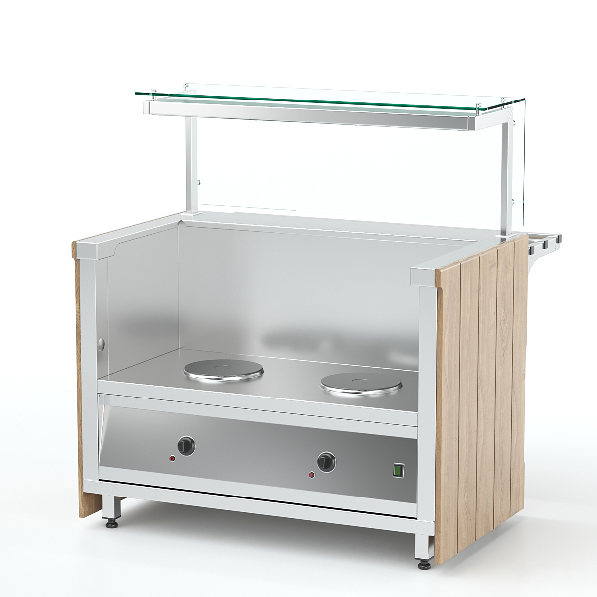 Мармит для первых блюд относится к линии раздачи «Kids» торговой марки «Refettorio». Мармит предназначен для кратковременного хранения в горячем состоянии емкостей с первыми блюдами и раздачи их потребителю. Столешница из нержавеющей стали. Тип электронагревательного устройства -трубчатый электронагреватель (ТЭН), материал конфорки - чугун. Мармит оснащен полкой и защитными стеклами. Максимальная распределенная нагрузка на стеклянную полку 15кг. Имеет светодиодную подсветку в нише фасадной части и подсветку рабочей зоны. В стандартный комплект поставки направляющая и фасады не входят (доп. опция).