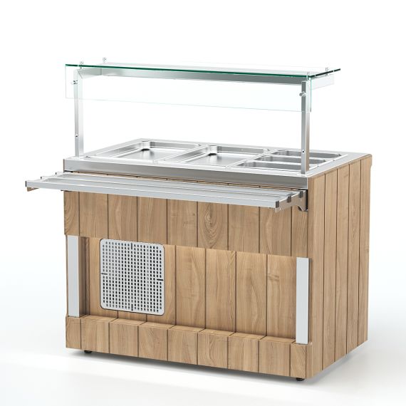 Прилавок холодильный относится к линии раздачи «Kids» торговой марки «Refettorio». Предназначен для кратковременного хранения пищевых продуктов, демонстрации и раздачи холодных закусок и третьих блюд. Столешница с углублением в 100 мм для установки функциональных емкостей. Столешница из нержавеющей стали. Класс прилавка высокотемпературный (от 1° до 10). Холодообеспечение встроенное. Тип оттаивания: естественный. Оснащен полкой и защитным стеклом. Максимальная распределенная нагрузка на стеклянную полку 15кг. Имеет светодиодную подсветку в нише фасадной части и подсветку рабочей зоны. Со стороны персонала в прилавке имеется розетка с защитной крышкой. В стандартный комплект поставки направляющая и фасады не входят (доп. опция).