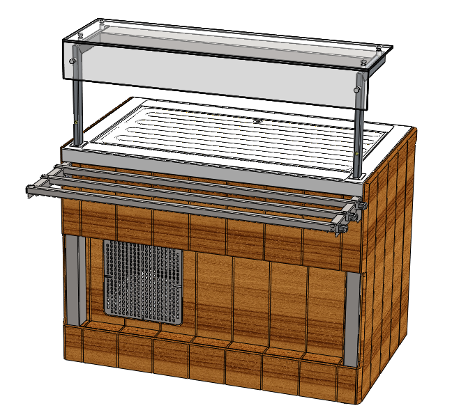 Прилавок с охлаждаемой поверхностью относится к линии раздачи «Kids» торговой марки «Refettorio». Предназначен для кратковременного хранения пищевых продуктов, демонстрации и раздачи холодных закусок, третьих блюд и охлажденных напитков потребителю. Столешница из нержавеющей стали. Класс прилавка высокотемпературный (от 1° до 10). Холодообеспечение встроенное. Тип оттаивания: естественный. Оснащен полкой и защитным стеклом. Максимальная распределенная нагрузка на стеклянную полку 15кг. Имеет светодиодную подсветку в нише фасадной части и подсветку рабочей зоны. Со стороны персонала в прилавке есть ниша для инвентаря и розетки с защитной крышкой. Как дополнительная опция ниша может быть снабжена створчатой дверкой. В стандартный комплект поставки направляющая и фасады не входят (доп. опция).