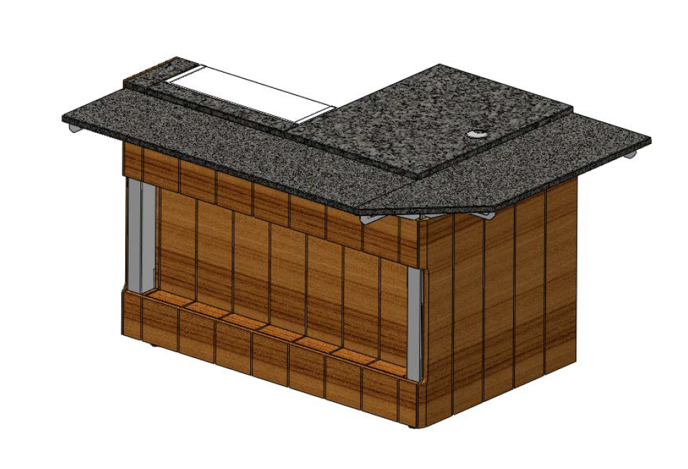 Прилавок Г-образный кассовый относится к линии раздачи «Kids» торговой марки «Refettorio». Прилавок предназначен для установки на него кассового аппарата для расчета с клиентами. Модуль выполнен в Г-образной форме, отсутствует левая стенка. Столешница из искусственного камня. Прилавок имеет правое исполнение (направление потока справа на лево). Для удобства подключения кассовых приборов в нише прилавка вмонтированы две розетки с защитными крышками. На столешнице прилавка имеется две заглушки под кабель-канал. Предусмотрены специальные полки для размещения системного блока персонального компьютера. Имеет светодиодную подсветку в нише фасадной части. Как дополнительная опция прилавок может включать встроенный съемный денежный ящик, запираемый на ключ. В стандартный комплект поставки направляющая и фасады не входят (доп. опция).